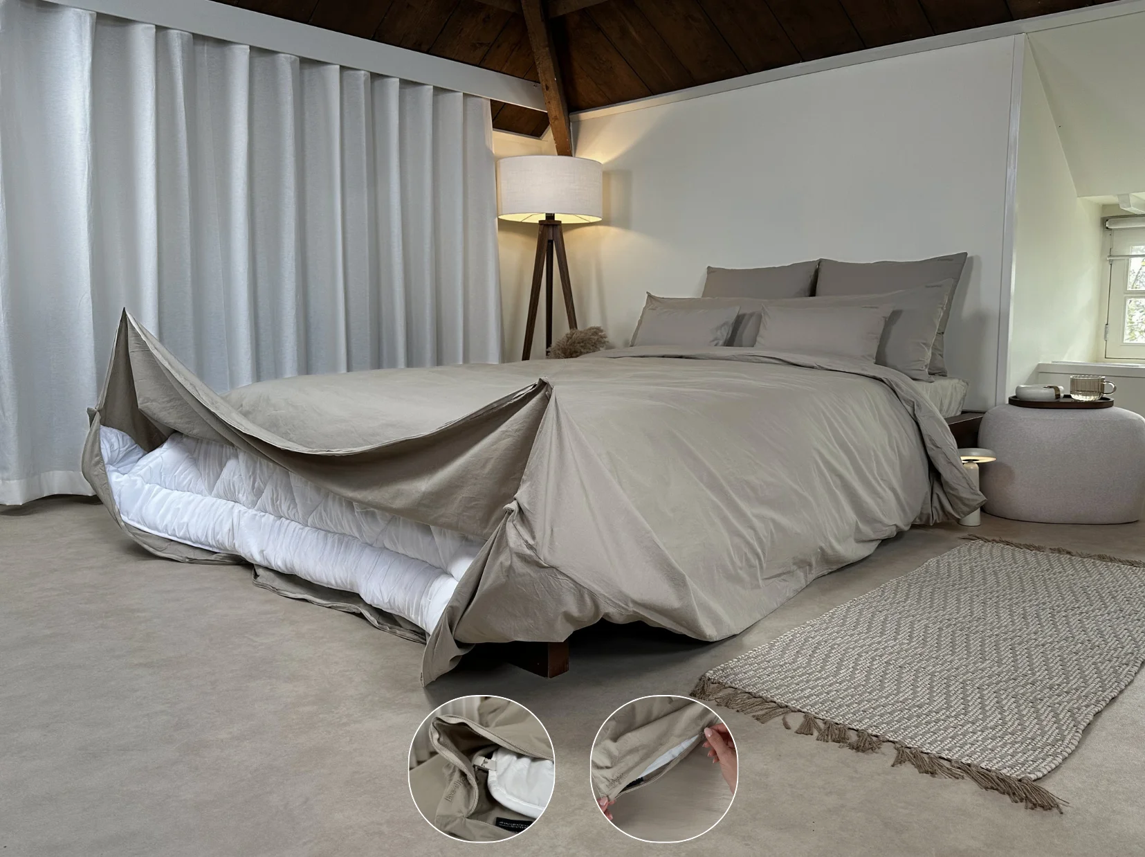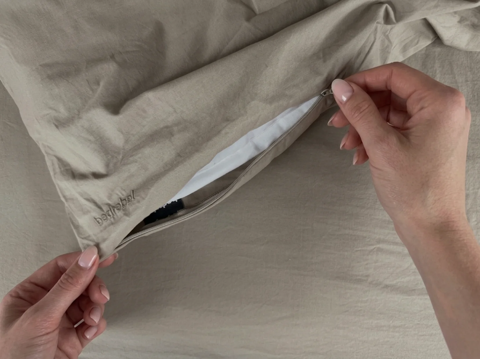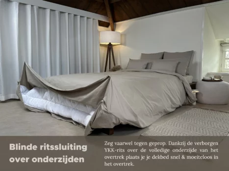 Pak de twee bovenste hoeken vervolgens aan de buitenzijde, til het overtrek met dekbed op en schudden maar. Bevestig tot slot de onderste Bedrebel dekbedclips en rits het Bedrebel dekbedovertrek easily closed all around again. Sleep well!