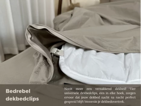 (De 4 universele dekbedclips zitten standaard in elk Bedrebel dekbedovertrek.)