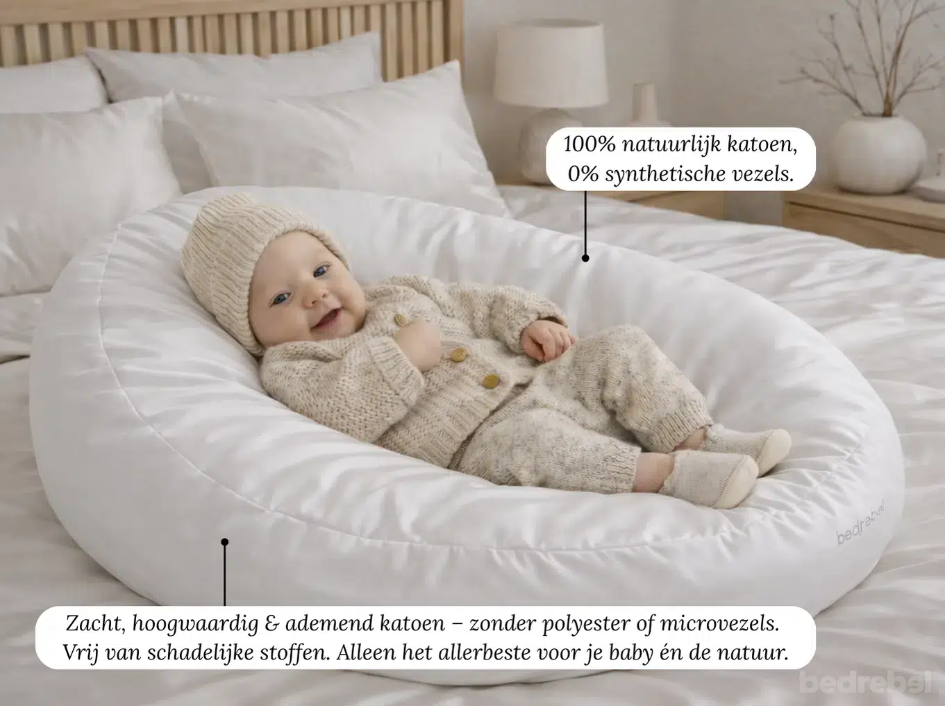 Het Bedrebel dreamteam adviseert een bolster-/ voedings-/ zijslaap-/ zwangerschapskussen gevuld met met hoogwaardig Thermofill®. Een veilige en duurzame keuze vandaag de dag. Het realiseert in de beste slaaphouding voor de kleine baby liggend op zijn of haar babynestje gemaakt van het bolsterkussen in combinatie met de baby relax hoes. Daarnaast realiseert het ook in de beste slaaphouding voor de mama of papa indien in gebruik als bolster-/ zijslaap-/ zwangerschapskussen.