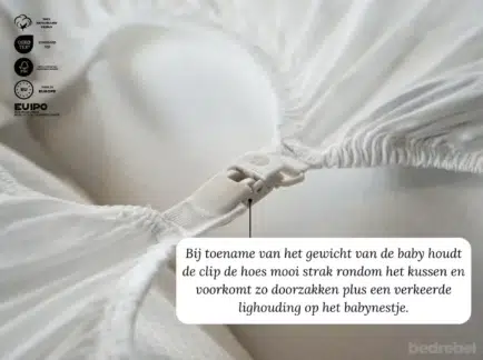 Een verkeerde lighouding of helemaal wegzakken in het midden van het nestje, dat wil je uiteraard niet voor je lieve baby. Daarom heeft het Bedrebel dreamteam geleerd van andere op de markt verkrijgbare baby relax hoezen en uiteraard geluisterd naar de feedback van vele ervaren mama's. Als oplossing voor het doorzakken in het midden van het babynestje & dus ter preventie van een verkeerde lighouding, heeft de unieke Bedrebel relax hoes een unieke Bedrebel clip aan de onderkant. Deze clip verbind eenvoudig de linker kant van de relax hoes met de rechter kant. Zo blijft de relax hoes aan de bovenkant namelijk te allen tijde voldoende strak en ligt jouw kleine dotje, ook als deze al wat weekjes ouder is geworden en in gewicht is toegenomen, in een perfecte houding op zijn of haar knusse babynestje. Alleen als jouw kleine engel perfect ligt en slaapt, kan het Bedrebel dreamteam ook met een gerust hart naar bedje toe. Daarom alleen het beste en veiligste design voor jouw kleine rebel!
